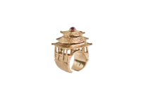An oriental temple between your fingers. The discovery of the sacred is enshrined in the realistic and elegant details of this scenic ring, surmounted by the sparkle of a cabochon garnet.
