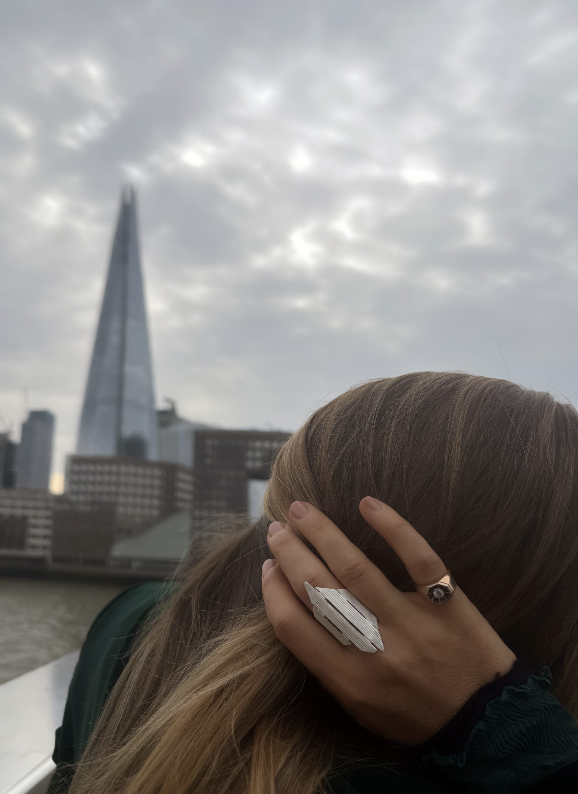 Inspired by The Shard in London, this ring translates the skyscraper’s vertical grace and weightless geometry into a wearable form. The subtly offset facets echo the shifting planes of the building, capturing light from every angle and reflecting it in multiple directions.